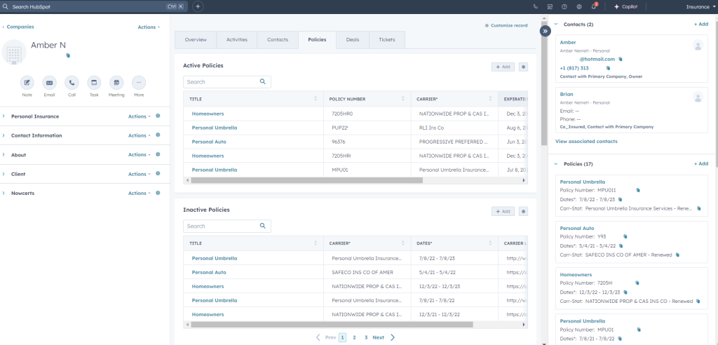 Having synced client, contact, and policy data in HubSpot allows you to see important information while you communicate with clients PLUS you can automate your business and renewal processes with custom workflows and sequences. Ask about our PowerSync/HubSpot solution for insurance agency’s to optimize your client support processes.